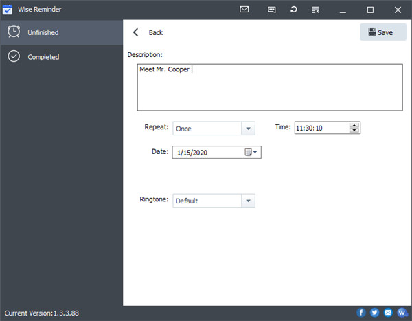 wise reminder是一款小巧的记事提醒工具,对于经常使用电脑工作的朋友,日常事务非常多,大事小事堆在一起,自己脑袋容量有限,肯定会忘记一些该做的事的,俗话说,好记星不如烂笔头,既然用电脑工作的话那就用一个软件开提醒自己吧。wise reminder就是一个能够提醒你的贴心小管家,你可以把本周或者本月的重要事项保存在这,时间到了它会自动响铃提示用户的,操作也非常简单,快速设置,只需几步即可完成提醒事项的编辑,对于记性不是很好的朋友,需要处理各种重要事项,这款wise reminder软件最适合不过了。