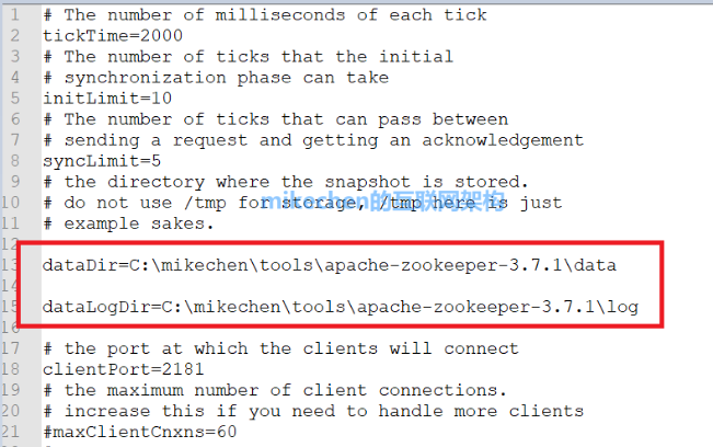4、进入conf文件夹下面,修改zoo.cfg配置文件,把dataDir=/tmp/zookeeper修改成zookeeper安装目录所在的data文件夹,以及dataLogDir修改为log文件夹。