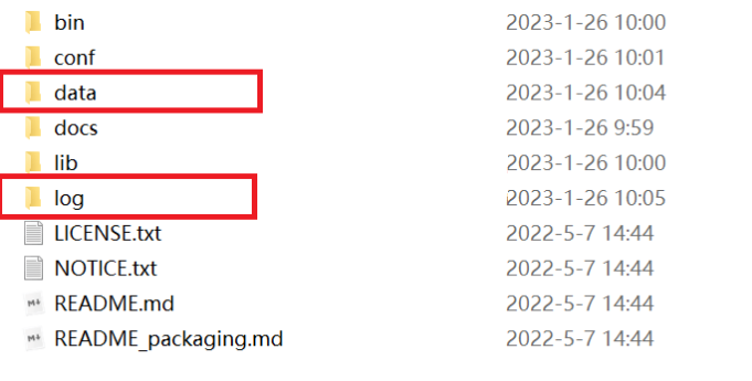 3、在根目录下新建一个data文件夹和一个log文件夹,分别存储数据和日志。