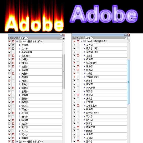 4、新建一画布,最好黑底白字,输入文字,切换到“通道”面版,Ctrl+文字图层,点面版下边第二个按钮,将选区存储为通道,然后把回图层面版,栅格化文字图层,打开动作面版,选中所需要制作的文字效果,单击面版下边的播放按钮,即可自动生成字体效果。