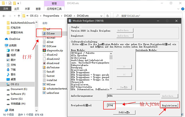 5、并运行该目录内D2.exe,输入JC9A,点register激活;