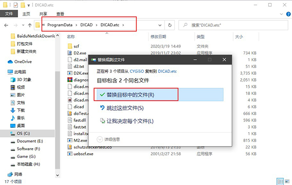 3、成功安装后,将CYGiSO文件夹下的的“D2.exe,dicad.m2”复制到【C:\ProgramData\DICAD\DICAD.etc】