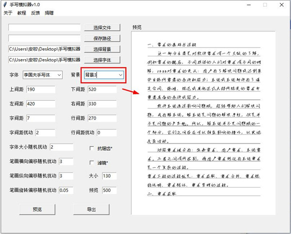 参数栏,负责手写字的参数设置。默然参数为默认背景下较为合适的参数。若选择默认背景,不需要进行过多的调节。