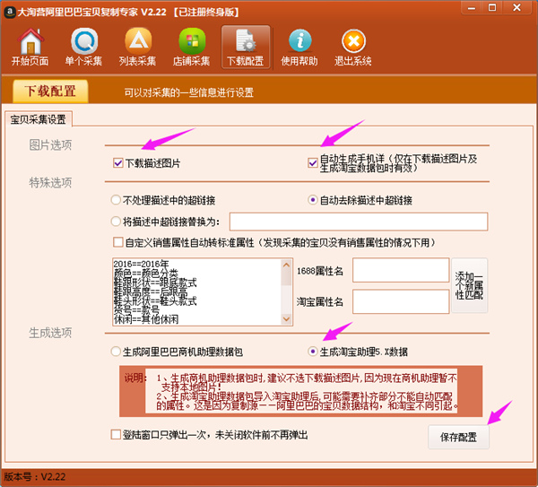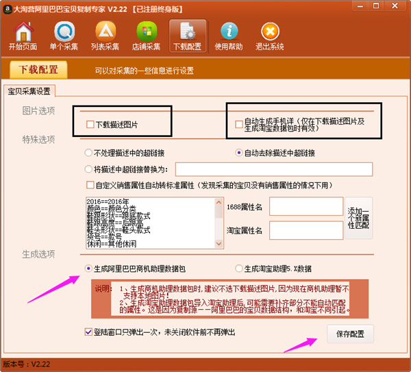 2、复制阿里的宝贝,生成淘宝的数据包,上传到淘宝的话,需要勾选下载描述图片,然后选择生成淘宝数据包。最后记得要保存配置,如下图: