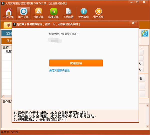点确定后,会弹出一个登陆窗口,然后右拉滚动条,输入账号登录一下(可用阿里或淘宝的账号登录,用小号或子账号登录也可以),登录成功后,不用管窗口中的提示,关闭窗口即可自动采集生成数据包。
