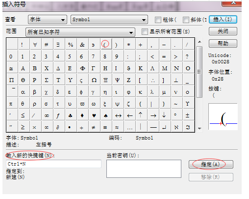 如果某个特殊符号经常使用,可对其进行设定快捷键操作,点击符号后,将光标放在“输入新的快捷键”一栏中,按下设定好的快捷键,点击“指定”即可完成设定。对于同一个符号甚至可以定义几个快捷键。
