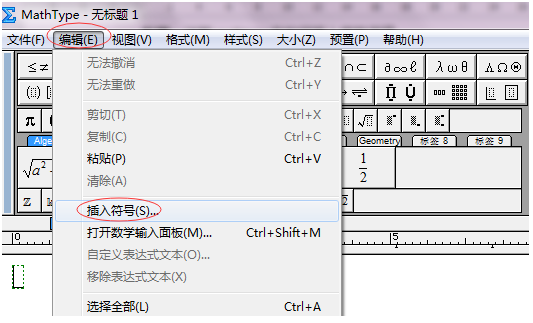 步骤一 点击MathType软件菜单中的编辑->插入符号。
