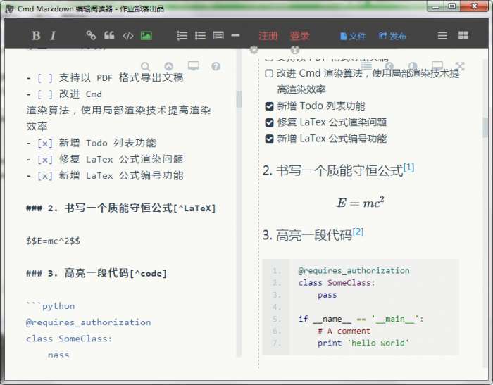 1、实时同步预览我们将 Cmd Markdown 的主界面一分为二,左边为编辑区,右边为预览区,在编辑区的操作会实时地渲染到预览区方便查看最终的版面效果,并且如果你在其中一个区拖动滚动条,我们有一个巧妙的算法把另一个区的滚动条同步到等价的位置,超酷!