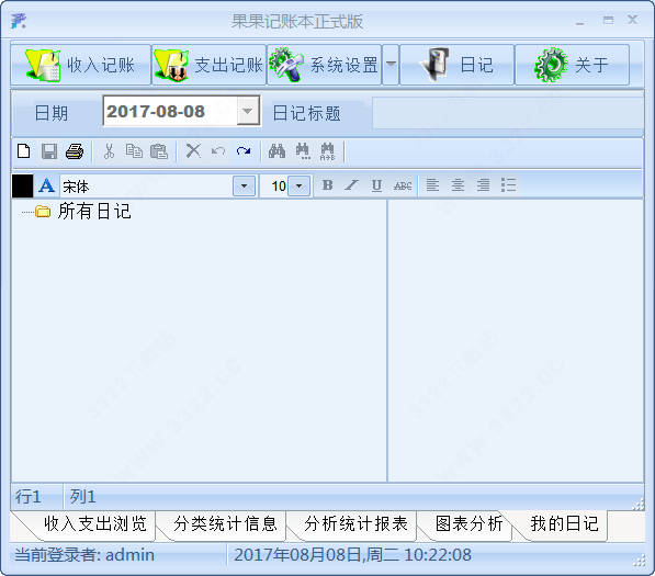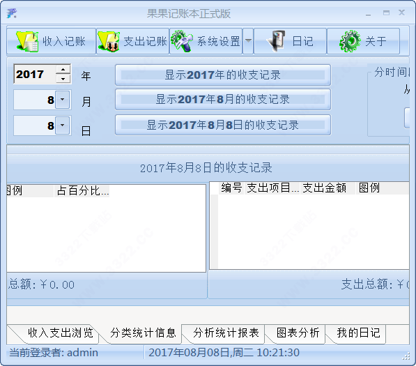 1、记录每天的收支流水账。2、分析年、月、日收入及支出的比重;分类统计收支图形展示及年、月、日季报表输出打印。