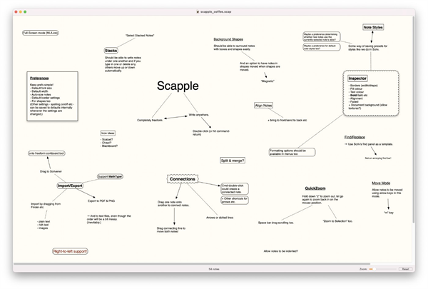 Scapple的操作简单直观,用户可以快速进行节点的创建、编辑和移动,并通过缩放和平移功能轻松导航大型思维图。