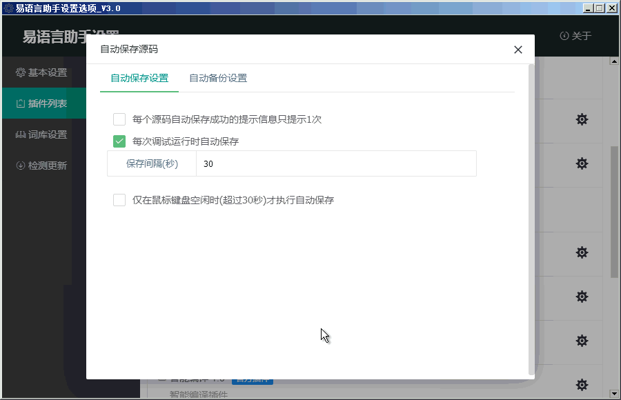可自定义设置多长时间自动保存一次源码,防止源码因停电或其它原因丢失,造成不可挽回的结果。可以将源码文件进行单独的备份。