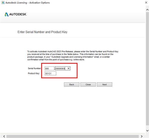 11、输入cad2023序列号【666-69696969】,由于软件自带秘钥无需输入,点击next继续;