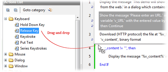 宏脚本编辑器可以编辑宏脚本的有力工具。你只需拖放适当行动,开发自动化应用程序,不写一行代码即使创建一个复杂的宏。在脚本编辑器中,所有的行为都是宏观的方式给出了清楚的描述他们做什么。这大大降低了学习成本和开发成本。