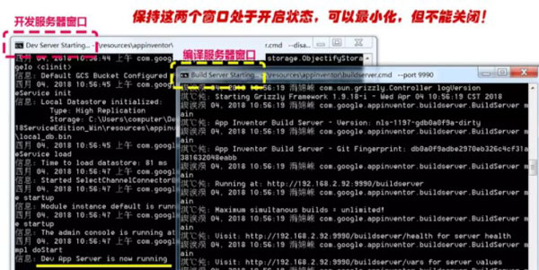 执行上述的启动命令,将打开两个黑色的命令行窗口,如图3所示,其中的Dev Server为开发服务器,我们在AppInventor开发环境中的每一项操作都会引起这个窗口中内容的刷新,在开发过程中必须保持这个窗口处于开启状态,可以最小化,但不能关闭。另一个窗口的标题是Build Server…,这个是编译服务器窗口,当你选择编译菜单时,这个窗口的内容会刷新。在日常开发过程中,如果暂时不需要编译项目,可以将这个窗口关闭,以节省系统资源。