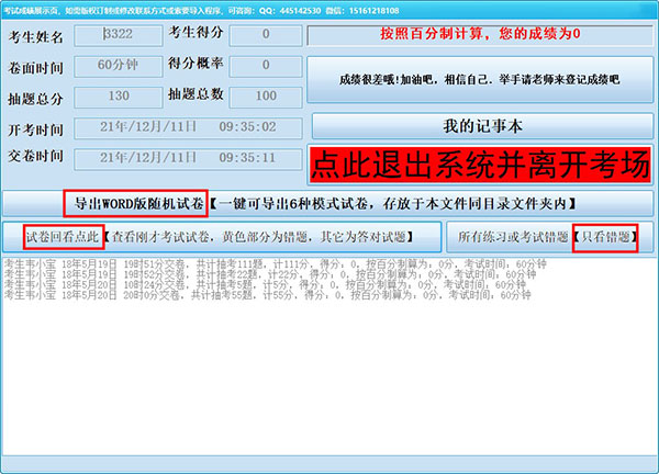 5、待用户考试结束并交卷后,用户们可以立马看到自己考试的结果,而且用户还可以通过以下界面进行查看错题、导出随机试卷、回看考卷、退出系统等操作;