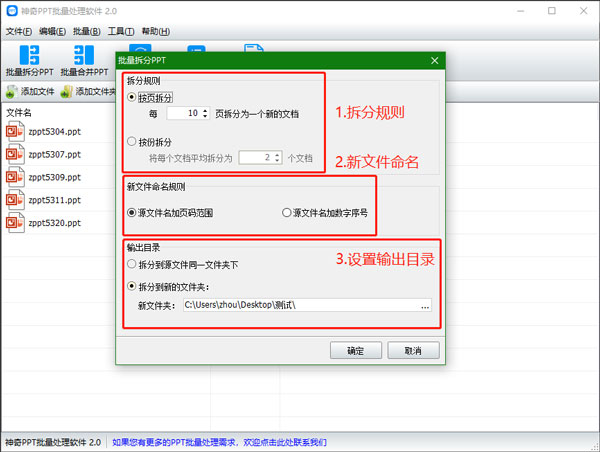 导入PPT文件后,点击“批量拆分PPT”按钮,设置拆分规则、新文件命名规则、输出目录,点击确定即开始批量处理PPT文件,如下图所示: