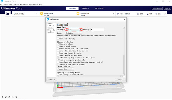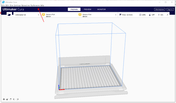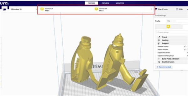 1、初步设置在边栏中检查打印芯和材料是否与挤出机进行设置匹配。挤出机1应选择装有PLA的AA 0.4打印芯,挤出机2应装有AA 0.4打印芯而不是支撑材料。当使用Ultimaker NFC材料时,材料设置会自动设置。