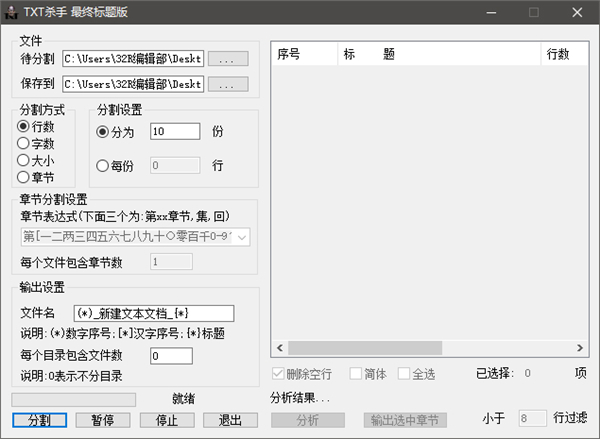 TXT杀手最终版这软件真是个好东西,完全免费,特别适合咱们这些爱看小说的人。平常下载的TXT电子书,文件一大阅读器就卡死或者打不开,这问题太常见了,而这个工具就是专门解决这个痛点的。它支持按章节、行数、字数或者文件大小来切分,分割后的文本排版整齐,绝不会出现乱码或丢字的情况,这点让我特别放心。最让我惊喜的是,虽然名字叫TXT杀手,但实测按大小分割时连其他格式的文件也能搞定,简直是个万能分割神器。操作起来也简单,选好文件和保存路径,设置好分割条件点一下就行,而且它支持多线程处理,速度比手动复制粘贴快太多了,省时又省力。对于经常处理大体积文本的朋友来说,这绝对是个必备的效率工具。 使用教程 首先运行TXT杀手,在“待分割”里选择要分割的文件,“保存到”里选择保存位置,然后在分割里面选择分割(支持行数、字数、大小、章节),然后设置分割数量、输出文件名设置等,最后点击分割即可。 功能特色 1.TXT杀手最终版可以选择按照章节、行数、字数、大小分割; 2.选择按大小分割的时候可以分割任意类型的文件(即可以当作万能分割工具使用); 3.多线程,分割速度快。