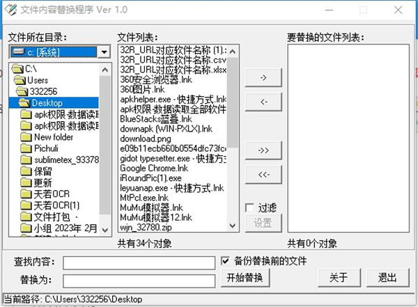 1、程序免安装,用户仅需双击“文件内容替换程序.exe”即可正式使用2、在“文件所在目录”中选择要更换的文件,这时选中之后的“文件列表”可显示相应的文件文本,同时利用“←→”箭头将要替换的文件添加到“要替换的文件列表”中,完成点击“开始替换”即可完成文件的替换