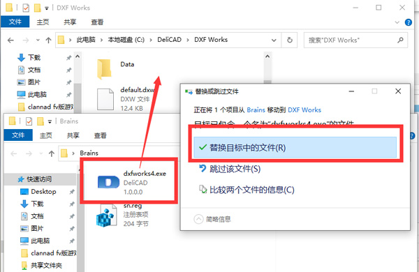 6、接下来对软件进行激活,将brains文件夹中的“dxfworks4.exe”复制到软件安装目录下替换即可