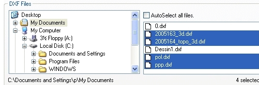 2、使用左侧窗口浏览您的磁盘。DXF文件出现在右侧窗口。您可以在点击时按住[Ctrl]键选择多个文件。如果您选择该选项,那么该目录中的所有DXF文件将被自动选择。