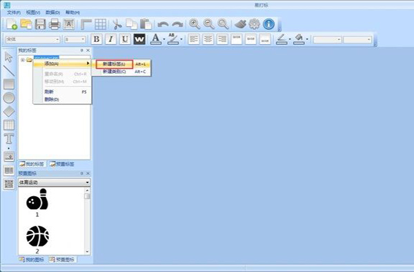 首先我们要新建一个标签文件。用鼠标右键点击软件主界面左边我的标签列表,打开右键菜单。点击右键菜单中的添加,展开添加列表,选择新建标签,就可以新建一个新的标签;