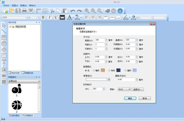 在标签新建窗口中,我们需要输入标签的尺寸、边距、背景图、背景色等参数。设置完成之后点击确定就可以按照设置的参数新建一个标签;