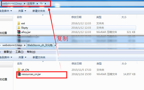 2、然后将“WebStorm_zh_汉化包中的resources_cn.jar” 复制到主程序lib文件夹中,重新打开软件就能正常显示中文了。