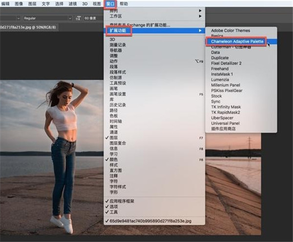 4、运行Photoshop版,在菜单栏的窗口中的扩展功能中就能看到安装好的Chameleon Adaptive Palette插件了