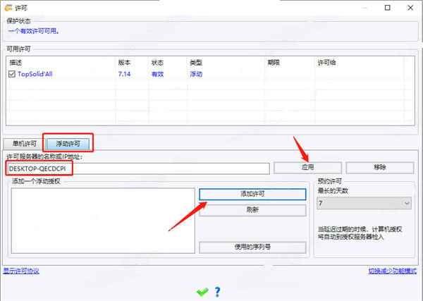 13、运行软件,先选择浮动许可,然后在输入框中输入你的电脑名称,点击应用按钮,出现TopSolid'All许可证后选择并点击添加许可证即可完成破解;