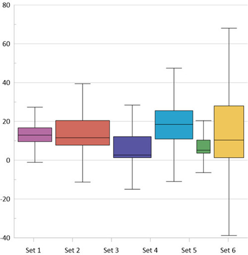 在 Grapher Preview 中控制箱线图的宽度!一起更改所有箱线图的宽度,或为每个箱线图使用可变宽度。变量设置将根据每组数据中的样本条目数改变大小。使用此设置是快速比较每个框的数据总体的好方法,这可以作为统计显着性的指标