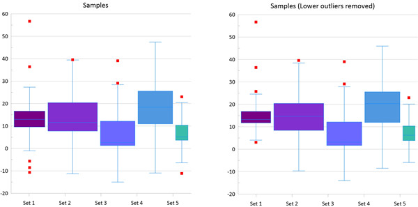 在 Grapher Preview 中将裁剪和/或标准过滤器与箱线图一起使用!标准过滤器允许您绘制数据并根据您选择的标准排除或包括数据值,而无需从文件中手动删除这些数据。轻松删除异常值、负值或错误记录