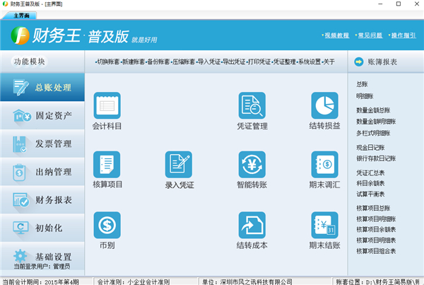 账簿报表:总账、明细账、数量金额总账、数量金额明细账、多栏式明细账、凭证汇总表、科目余额表、试算平衡表、核算项目总账、核算项目明细账、核算项目余额表;