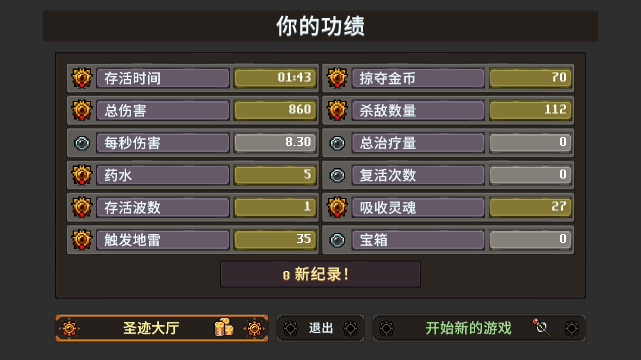 新手攻略建议玩家在开局时选择合适的装备,边打边跑寻找宝箱,合理利用资源提升实力。游戏结束会显示详细对局信息,同时圣迹大厅提供武器装备和能力升级选项。