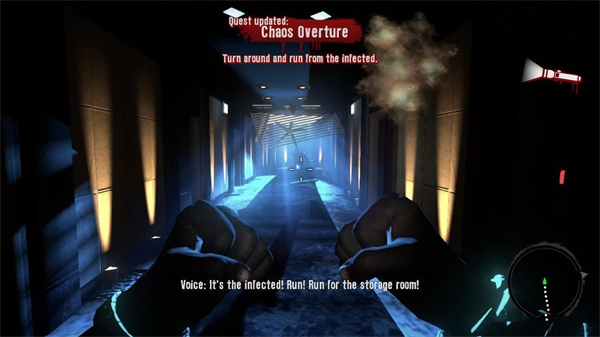 进入电梯里后缆线突然断掉,电梯落到了最底层,出来之后顺着指示来到这条走廊,前面可以看到僵尸,