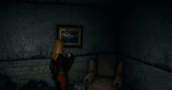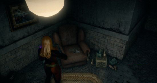 3、往里面一直走就会到达一个怪怪的房间,座椅上有个小手枪,武器轮中放在RPG那格。