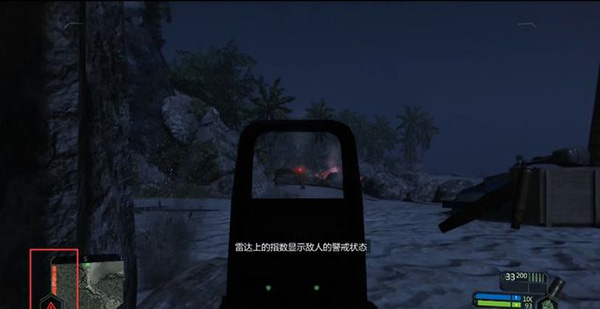 屏幕左下角的雷达表示你的暴露程度和敌人警觉度,红色三角叹号表示敌人已经发现你,