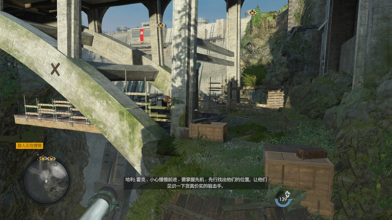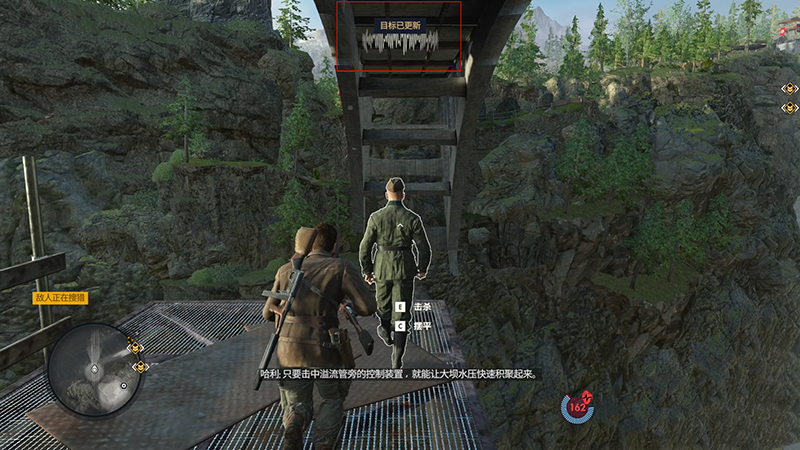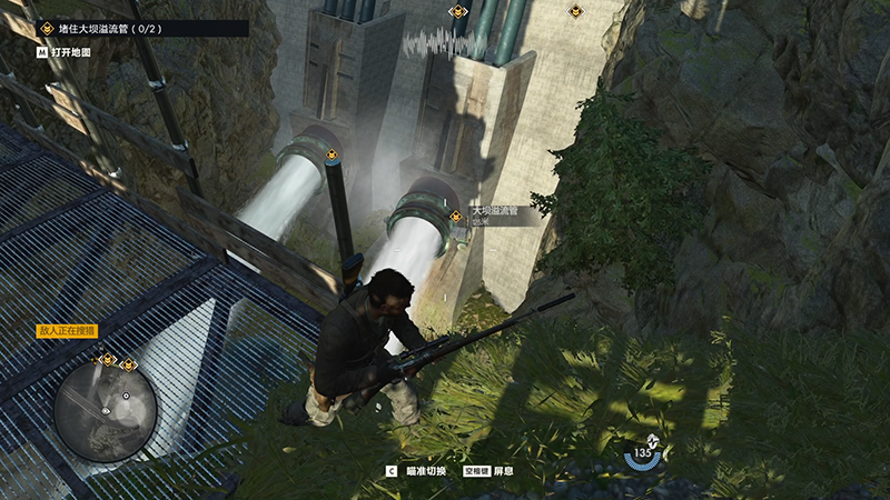 击杀他以后我们往右手边下方看,下方有【选项B-堵住大坝溢流管(0/2)】,用狙击枪打掉它们。
