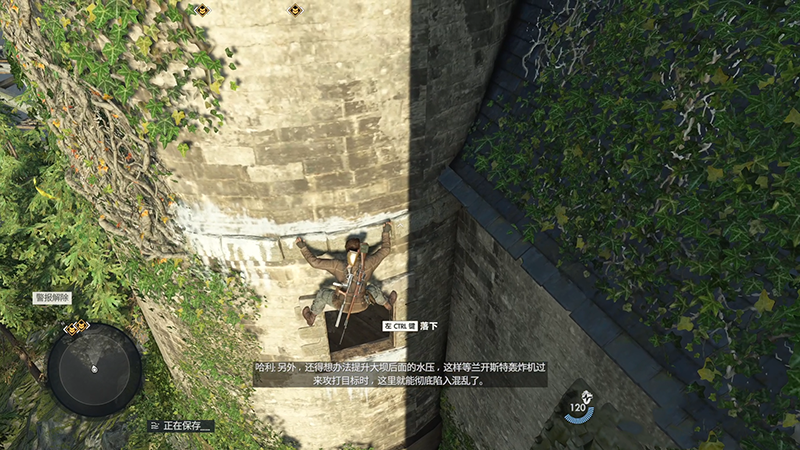 进入窗口以后右手边有子弹可以获得,拿上后我们按空格顺着绳子滑下去。
