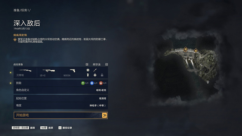 在游戏开始之前我们可以在准备界面更改各种设置,这里全部选择默认,技能要进游戏击杀敌人或者做完任务才会给技能点,技能选择推荐先点绿色的,游戏难度是神枪手(后面会选择更简单的,收集品太多,难度高了不好收集),选好后点击开始游戏。