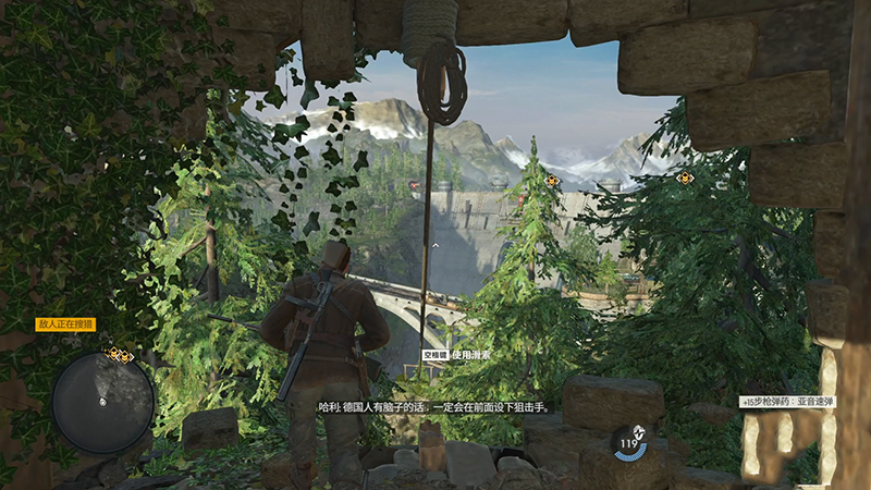 左手边刚好有一个背对着我们的士兵,附近有水流的声音,会影响敌人的听力,我们可以直接跑着去他背后用E击杀他,画面上方的线条就是此时的声音大小,这个声音越大越方便我们行动。大多数士兵的尸体都可以按住E键搜索物品,没有资源的时候可以搜索一下。