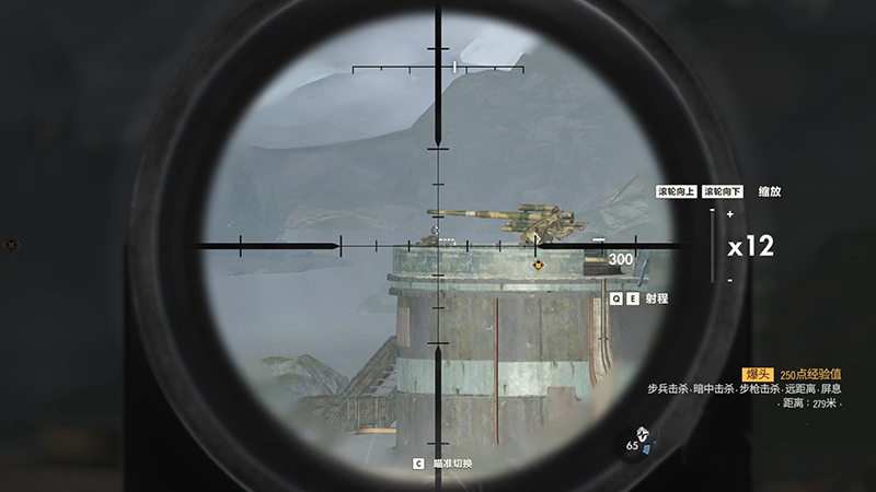 确认完目标,我们正式开始游戏,我们可以先解决掉对面左中右的狙击手,键盘的QE键可以更改狙击枪的射程,鼠标滚轮可以缩放远近,按住空格键可以屏息来精准瞄准,看到瞄准框变红了就基本没有误差了。