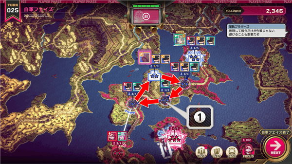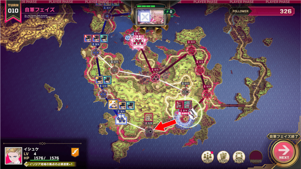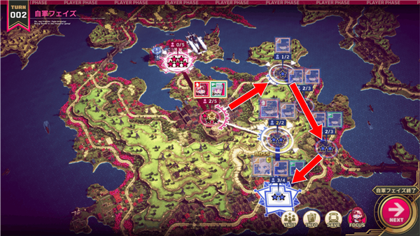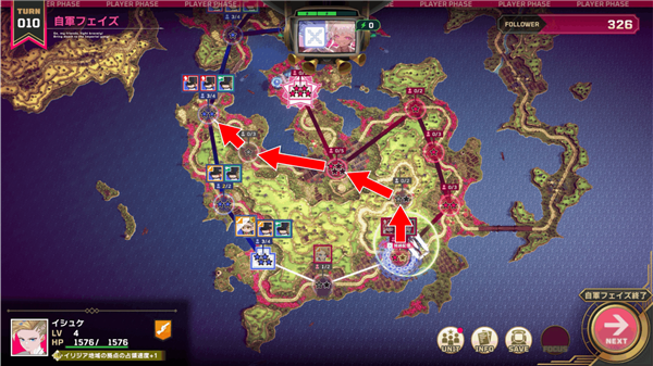 将防守交给伊修克,斯卡蕾特和莉莉就沿着地图上箭头的路线移动,去切断敌方的补给线吧!想要速攻的话可以优先移动,想要巩固阵线的话可以在中途的据点停留,提升耐久度(★)。