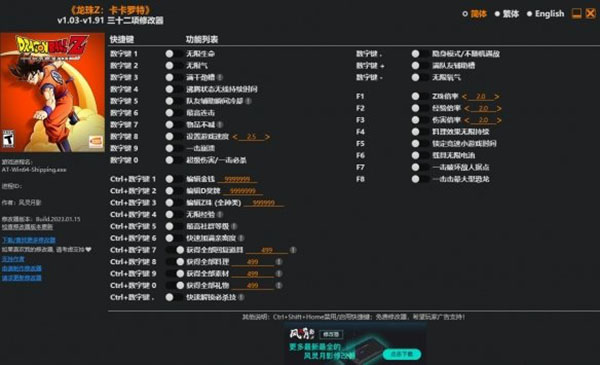 龙珠z卡卡罗特修改器是针热门漫改游戏《龙珠z卡卡罗特》游戏而打造的一款十分好用的辅助修改软件,由大神风灵月影精心制作。该修改器提供了很多好用且强大的修改功能,包含队友辅助瞬间冷却、最高连击、超级伤害/一击必杀、无限经验、最高社群等级等三十二项修改功能。能够全方位满足用户的使用需求,帮助用户获得无限生命,轻松完成各种关卡和挑战。除此之外,龙珠z卡卡罗特修改器使用很简单,运行游戏之后再运行修改器,就能体验强大的修改功能了,并且还完美适配于游戏的v1.03至v1.10版本,只需要按下对应的键位即可体验强大的修改功能。喜欢的用户还等什么,快来下载体验吧。