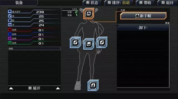 本作的装备和属性并不复杂,装备分为两个武器位(并没有主副手方面的差异)、三个防具位(头、衣服、鞋),装备可以提升属性(见下文),部分高级装备会增加特质