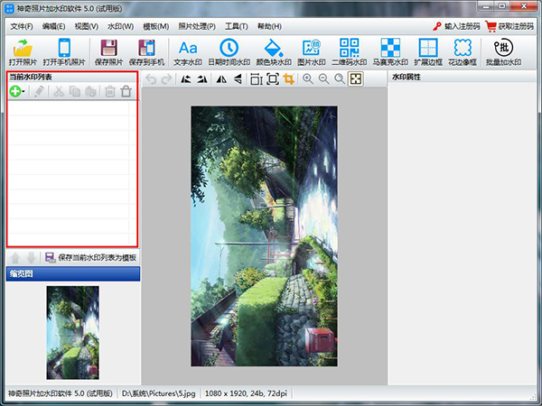 可以看到,软件中间区域显示刚刚添加得照片文件,软件左侧“当前水印列表”为空,代表此时未添加任何水印到当前照片当中