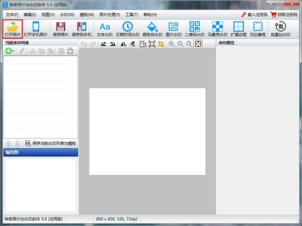 第一步:点击软件左上角“打开照片”按钮,选择您要添加水印的照片文件,界面如下: