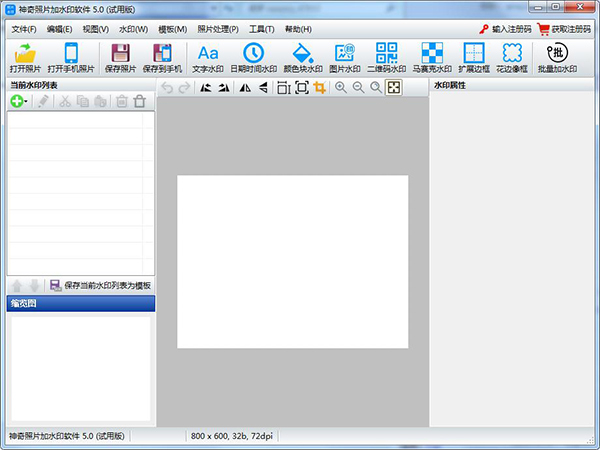 神奇照片加水印软件官方版是一款功能强大的图片处理软件,通过该软件可以快速的给图片加上各种不同的水印,制作专属于你的水印效果,自由添加设置图片的特效,还可以实现批量添加水印的操作,使用上手非常的简单方便。软件支持文字水日期时间水印、颜色块水印、图片水印、二维码水印、马赛克水印、扩展边框、花边相框等水印功能,超多的水印可以让你自由选择添加,设置好之后,就可以快速的处理多张不同的图片,效果非常的明显。需要添加各种不同水印的用户可以下载使用该软件,不仅可以用于商业用途,还可以很好的保护用户的作品,让用户将自己的信息添加到水印当中,较为常用的几种水印使用也是非常的方便快速,帮用户解决水印所带来的问题。有需要的朋友欢迎下载体验!