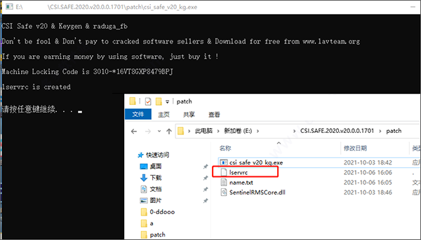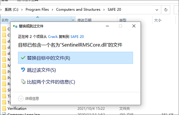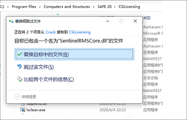 8、将上面生成的(lservrc)许可证和应用的模拟器 (SentinelRMSCore.dll) 复制到文件夹安装目录【C:\Program Files\Computers and Structures\SAFE 20】下并进行替换;