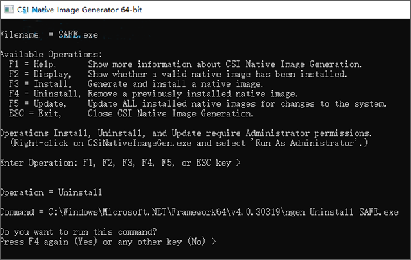 5、安装完成,删除默认创建的 .net 本机映像。运行安装目录下的CSiNativeImageGen.exe,并选择卸载选项(F4);